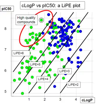 Lipophilic efficiency[1] (LiPE), sometimes referred to as ligand-lipophilicity efficiency (LLE) is a parameter used in drug design and drug discovery to evaluate the quality of research compounds, linking potency and lipophilicity in an attempt to estimate druglikeness.[2][3] For a given compound LiPE is defined as the pIC50 (or pEC50) of interest minus the LogP of the compound.