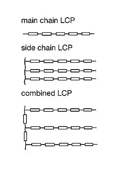 LCPs are categorized by the location of liquid crystal cores. Due to the creation and research of different classes of LCPs, different prefixes are used to help the classification of LCPs.[10] Main chain liquid crystal polymers (MCLCPs) have liquid crystal cores in the main chain. By contrast, side chain liquid crystal polymers (SCLCPs) have pendant side chains containing the liquid crystal cores.[10]