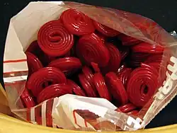 In many countries there is also a product sometimes known as red liquorice (red licorice). It has a recipe very similar to a common type of liquorice confection (a starchy or gummy binder with sugar added, extruded into the shape of a rope or tube with a chewy consistency), but instead of liquorice, it is made with other flavourings such as strawberry, cherry, raspberry, or cinnamon. More recently, products have been introduced in a wider variety of colours and flavours, including apple, mango, blackcurrant, and watermelon.