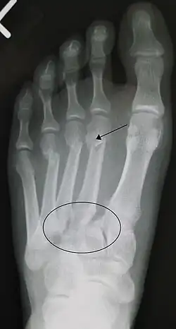 - ^ Rankine JJ, Nicholas CM, Wells G, Barron DA (April 2012). "The diagnostic accuracy of radiographs in Lisfranc injury and the potential value of a craniocaudal projection". AJR Am J Roentgenol. 198 (4): W365–9. doi:10.2214/AJR.11.7222. PMID 22451574.