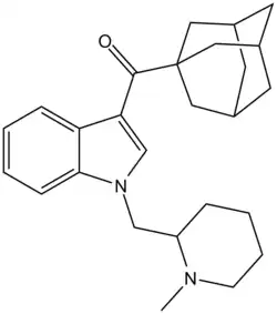 A moderately potent agonist with some selectivity for CB1, containing an unusual 3-(adamant-1-oyl) substitution on the indole ring. | ||||