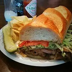 | French dip | Nationwide; origins in Los Angeles | Thinly sliced roast beef on a French roll or baguette, usually served au jus | |