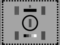 Test Card B was an early BBC television test card. It was very similar to Test Card A and also only broadcast as engineering tests.[2] The original card has since gone missing. The only differences were that the frequency bars were juxtaposed, the values were deleted, and an Ilford Panchromatic Response Chart placed below the circle where the letter box had been, the letter box in Test Card A was moved to the top of the card replacing the vertical resolution test.[5][2]