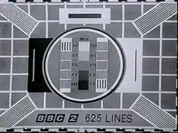 Test Card E was a television test card designed in 1964 and made to accommodate the 625-line system on BBC2, as opposed to the 405-line system of Test Card D.[2] However, Test Card E lasted for only four and a half days before being withdrawn.[19] Test Card E was thereafter replaced by a modified version of Test Card C, which lasted on BBC2 until December 1964, the illustrated version of Test Card C shown here replaced the first version, and was discontinued in September 1969, and when the colour Test Card F was introduced in July 1967, Test Card C was only shown between 9.00 and 9.58 a.m.