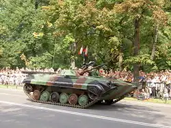 Poland – 916 BMP-1s are operational as of 2025.[21] 1,409 BWP-1s ordered in 1969 from USSR and delivered between 1972 and 1979.[1] Poland also bought 22 BWR-1D (BRM-1K) reconnaissance vehicles in 1987 from USSR[42] and 16 BWR-1S (modernized BPzV) reconnaissance vehicles from Czech Republic in the early 1990s. The number of BWR-1D and BWR-1S has not changed. There were 1,409 BWP-1s in service in 1994,[17] 1,367 on 1 January 1998,[43] 1,366 on 1 January 1999 and 1 January 2000,[44][45] 1,332 on 1 January 2002,[46] 1,328 BWP-1 IFVs on 1 January 2003,[47] 1,321 in 2004[48] and 1,307 at the beginning of 2006[49] (Polish Ministry of Defence states that on 8 January 2006 there were 1,298 BWP-1s[50]). 1,306 BWP-1s, 33 BWP-1Ds, 5 MP-31s and 6 ZWDSz-2s in service in the first half of 2008.[51] In 2022 800 BWP-1s are operational. To be replaced by new BWP Borsuk tracked infantry vehicle.[21] Some are donated to Ukraine forces during Russian invasion of Ukraine.[52]