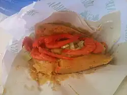 A popular Brazilian sandwich. The traditional recipe calls for cheese (usually mozzarella) melted in a bain-marie, slices of roast beef, tomato and pickled cucumber in a French bun with the crumb (the soft inner part) removed. |