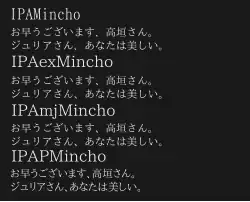 | IPAex Minchō | IPAex明朝 | Information-technology Promotion Agency, Japan | [F] IPA font licence | Part of IPA font series. Released from here.[13] | |