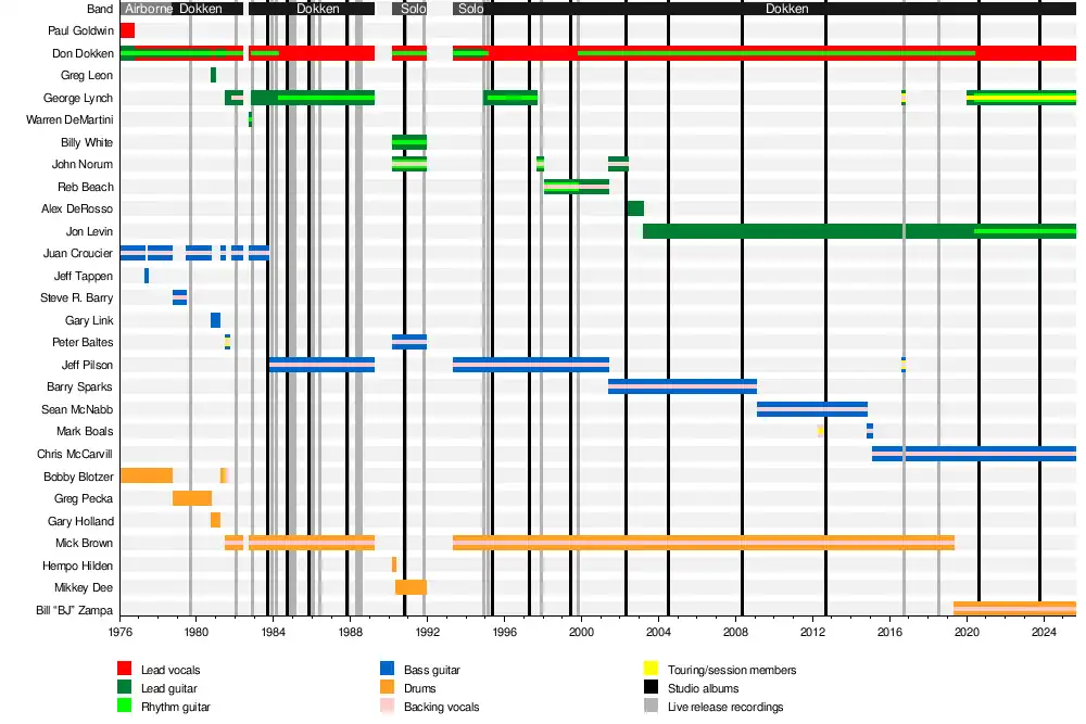 By the time they recorded their debut album Breaking the Chains, the band's lineup featured of Don Dokken as lead vocalist/rhythm guitarist, lead guitarist George Lynch, bassist Juan Croucier and drummer Mick Brown.