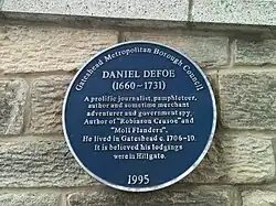 South side of Hillgate, adjacent St. Mary's Square[59] | 1995 | Author Defoe is thought to have lived at Hillgate around 1710 with a bookseller named Joseph Button. It had been said that he wrote his most famous work, Robinson Crusoe, whilst residing in the town but this has now been refuted.[61][62] |