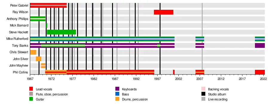 By November 1996, Ray Wilson had been appointed as the replacement for Collins in time for the recording of Calling All Stations, although his addition was not announced until the following June.[27] For the subsequent touring cycle, the new trio were joined by guitarist Anthony Drennan and drummer Nir Zidkyahu.[28] The tour ended in 1998, and by 2000 the group had disbanded.[29]