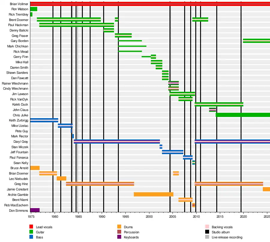 In June 2012, Helix announced that Brent Doerner would be leaving the band for a third time in September.[35] He was replaced by John Claus.[36] By February 2014, Claus had been replaced by Chris Julke, who recorded the band's next album Bastard of the Blues.[37] This was followed in 2019 by Old School, before Duck left in November that year and was replaced briefly by former guitarist Mark Chichkan and then by Gary Borden.[38]