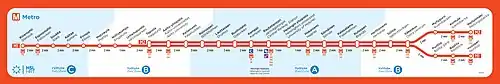 These are the stations on the current metro line. The names are listed first in Finnish, then in Swedish (and English, if applicable1). Bus transfers are not listed.