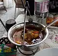 A rich bean soup, with many vegetables, smoked pork hock pieces and noodles. It is often made to be spicy or some sort of hot chili offered with it. | |