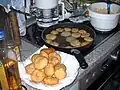 A type of bun, round puffed pastry, available with bacon or cheese, traditionally cooked on the fire. | |