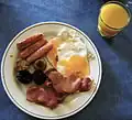 Rashers, sausages and eggs, often served with a variety of side dishes such as fried mushrooms, soda bread and puddings. |