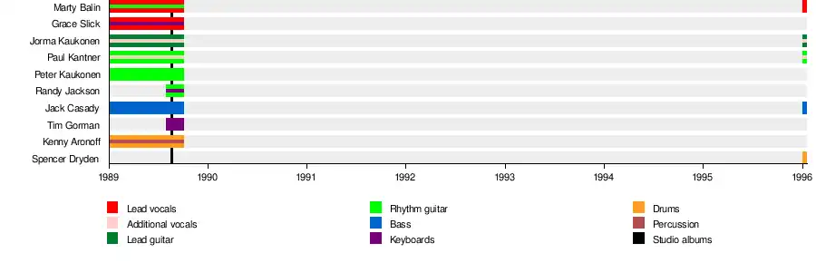 In 1989, Jefferson Airplane reformed for an album and tour, with Slick, Balin, Kaukonen, Kantner and Casady joined by session/touring musicians. A second reformation followed at the band's Rock and Roll Hall of Fame induction in 1996.