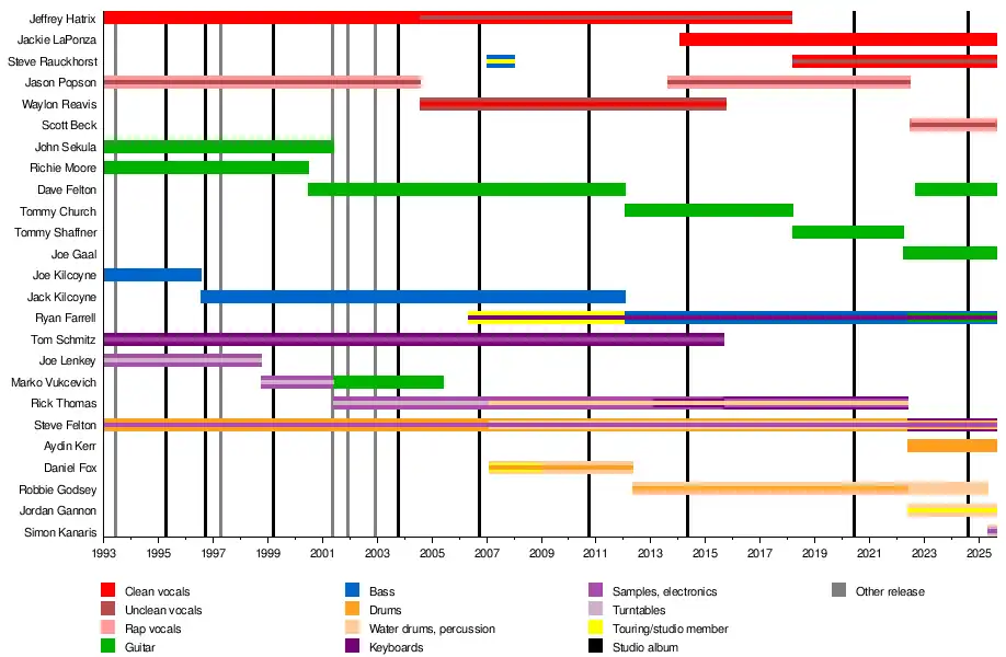 The band was founded in 1993 by vocalists Jeff "Nothing" Hatrix and Jason "J Mann" Popson, guitarists John "JJ Righteous" Sekula and Richie "Dinner" Moore, bassist Joe "Mr. Murdernickel" Kilcoyne, keyboardist Tom "Shmotz" Schmitz, drummer Steve "Skinny" Felton and DJ Joe "DJ Virus" Lenkey.[3] Live performances also featured dancers Jessica "Roxy" Haney and Marko "Bronson" Vukcevich, the latter also being video editor, alongside hired talent such as fire-breathers and gymnasts.