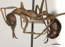 Roger[33] | 1861 | Specimens of this species are only known from workers collected in Queensland. The workers are large, measuring 21 to 22 millimetres (0.83 to 0.87 in). The head, node, thorax and postpetiole are red, the mandibles are yellow, and the antennae, clypeus and legs are reddish yellow. The gaster is black.[34] |