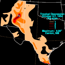 - October 7, 1954 – Rains subsided from a tropical depression that crossed from Texas into New Mexico. The highest precipitation was 9.8 in (250 mm) in Canton, which was the greatest rainfall total associated with a tropical cyclone in the state since 1950. The rainfall caused flooding in Roswell and along the Pecos River system.[10][11][12] The flooding caused millions in damage after flooding affected six towns and highways across the region. There were four confirmed fatalities with seven missing in the days after the storm.[13]