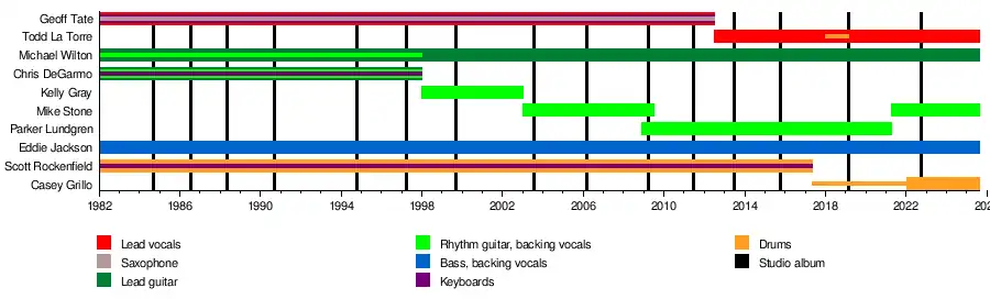 Queensrÿche is an American progressive metal band formed in 1982 from Bellevue, Washington. The band's original and most famous lineup consisted of guitarists Michael Wilton and Chris DeGarmo, drummer Scott Rockenfield, bassist Eddie Jackson, and lead vocalist Geoff Tate. The band currently consists of Wilton and Jackson alongside rhythm guitarist Mike Stone (from 2003 to 2008 and since 2021), lead vocalist Todd La Torre (who replaced Tate in 2012) and drummer Casey Grillo (who has been touring with the band since 2017 and recording since 2020).