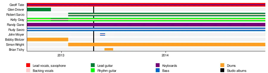 Tate's version of the band was announced in October 2012,[42] it included rhythm guitarist Kelly Gray (who had been a member of Queensryche), lead guitarist Glen Drover (Megadeth), keyboardist Randy Gane (Myth with Tate and Gray), bassist Rudy Sarzo (Ozzy Osbourne, Dio, Whitesnake, Quiet Riot) and drummer Bobby Blotzer (Ratt).[43] Drover later left in November[44] and was replaced by Sarzo's brother Robert (Quiet Riot, Hurricane),[45] and Blotzer was later replaced by Simon Wright (AC/DC, Dio, UFO).[46]