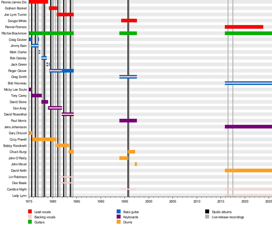 | Lead vocals | Ronnie James Dio | Graham Bonnet | Joe Lynn Turner | Doogie White | ||||