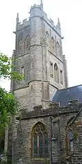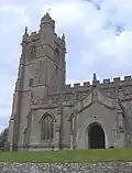 Dates from the 15th century. It has a three-stage embattled tower, supported by buttresses with corner pinnacles, tracery and gargoyles. There is a stone fan vault under the tower. | [28] | |