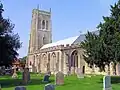 The mainly 15th-century church includes a nave with a clerestory, north and south aisles and, a rather short chancel considering the proportions of the rest of the church. The high tower that contains 10 bells dating from the 18th to 20th century and a clock dated 1884. Bells dating from 1734 and 1742 were made by Thomas Bilbie, of the Bilbie family. | [12][13] |