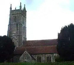 Dates from the 12th century, with a large 15th-century pinnacled sandstone tower, a Norman font and a rood screen that is the full width of the church. There has been a clock on the tower since the early 18th century. There is a peal of eight bells in the tower. Tenor 28cwt in C. The original five bells were re-cast by the celebrated Thomas Bilbie of Chew Stoke in 1735 to make a peal of six, and in 1898 four of these were re-cast and two were repaired by Messrs. Mears and Stainbank of London to commemorate the Diamond Jubilee of Queen Victoria. Two additional bells, the gift of Brigadier Ommanney, were added in 1928 to complete the octave, which does still contain two of the Bilbie bells. The present clock, installed in 1903, plays a verse of a hymn every four hours, at 8 am, noon, 4 and 8 pm, with a different hymn tune for every day of the week. | [13][35][36][37] | |