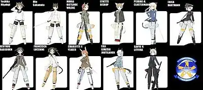 The Strike Witches mixed-media project features an extensive cast of characters created by Fumikane Shimada. The series takes place in an alternate Earth in the mid-20th century and revolves around a group of teenage moe anthropomorphic girls who use machines equipped to their legs known as Striker Units to do aerial combat. The characters are named after real-life pilots whilst their Striker Units are based on actual aircraft.