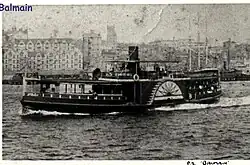| Balmain | 1883 | Paddle steamer. Built by B.S. Bridges of Balmain for the Balmain Steam Ferry Company. From 1901, run by the Balmain New Ferry Company. Replaced by the second series of Lady class ferries and broken up around 1910.[39] | Balmain, a harbourside inner west Sydney suburb. | 117 tons | 36.5 m | Paddle steamer | 1910 | More images...
