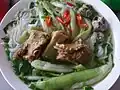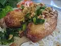 Southern Vietnam | Noodle dish | Grilled pork (often shredded) and cold vermicelli noodles over a bed of greens (salad and sliced cucumber), herbs and bean sprouts. Also often includes a few chopped up egg rolls, spring onions, and shrimp. Served with roasted peanuts on top and a small bowl of nước chấm.[1][3][6] |