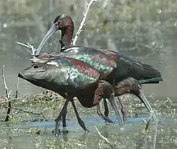 The family Threskiornithidae includes the ibises and spoonbills. They have long, broad wings. Their bodies tends to be elongated, the neck more so, with rather long legs. The bill is also long, decurved in the case of the ibises, straight and distinctively flattened in the spoonbills. Four species have been recorded in Iowa.