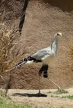 Bustards are large terrestrial birds mainly associated with dry open country and steppes in the Old World. They are omnivorous and nest on the ground. They walk steadily on strong legs and big toes, pecking for food as they go. They have long broad wings with "fingered" wingtips and striking patterns in flight. Many have interesting mating displays.