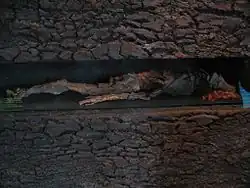 The man was found with his skull crushed and his leg broken. A rope was also found around his neck, indicating death by hanging or strangulation.[7][8] Examination of bog bodies such as Cashel Man have led scientists to speculate that wounds such as broken bones may have occurred after death due to the weight of the peat.[9] The body is in storage at the National Museum of Copenhagen.[7] |