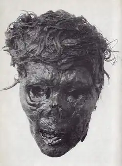 Studies show Grauballe Man was most likely a ritual sacrifice victim. His fingers had been so perfectly preserved in the bog that researchers were able to take his fingerprints. The man's face has been reconstructed to show what he had looked like when he was alive.[8][19] | |
