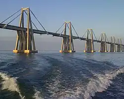 430 m (1,410 ft) | 11,200 m (36,700 ft) | Cable-stayed Concrete deck and pylons Railroad bridge |