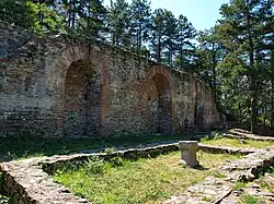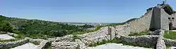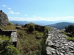 Ustra is a castle in the eastern Rhodope Mountains in southern Bulgaria. Its ruins lie 4 km (2+1⁄2 mi) southwest of the village of Ustren situated on a hill at approximately 800 m (2,600 ft) above sea level. The fortress was built in the 10th century AD to protect an important trade route. It was taken by the armies of Simeon the Great (r. 893-927), but after his death, it was among the lands given back to Byzantium in return for recognition of the imperial title of the Bulgarian rulers. Between the 12th and 14th centuries, it frequently changed hands between the two empires, but the Byzantines held it most of the time. | ![]() |