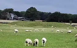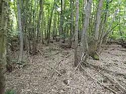 | This Norman castle was intended both to protecting the local villages and probably intended to operate with the castles at Glasshouse Woods and Howle Hill Camp as a screen to protect the city of Gloucester from military threats from Wales.[31] The castle itself is circular and relatively small, some 60 ft in diameter, with an inner and an outer bailey, the latter protected by a very tall vallum wall.[45] The outer wall was originally 15 ft tall.[46] Uniquely for a castle of this period the outer wall has a motte integrated into the design, rather than located at the centre of the castle.[44] Littledean castle was only occupied briefly.[44] | ||||