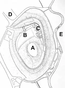 Probably a motte-and-bailey castle, although there has been some debate about its origin and purpose.[39][40] The motte has two baileys to the north. The inner bailey has one bank and the outer one a double bank. Norman and later pottery and iron objects were found during excavations in 1908.[38] The mound measures 30 metres (98 ft) across the top.[41] |