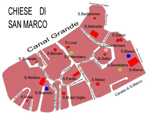 This is a complete list of churches in Venice classified by "sestiere" in which the city is divided. These are Cannaregio, San Polo, Dorsoduro (including the Giudecca and Isola Sacca Fisola), Santa Croce, San Marco (including San Giorgio Maggiore) and Castello (including San Pietro di Castello and Sant'Elena). It also details the churches on the islands outside Venice.