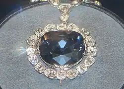 A 34.98-carat (6.996 g)[9] pear-shaped diamond, which sold for US$10 million in 2012.[10] Not to be confused with the Sancy. | ![]() Beau Sancy | |