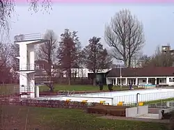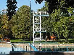 - Hallenbad Oerlikon (Zurich), with diving boards and platforms at 1/3/5/7.5/10 meters of height.[11]