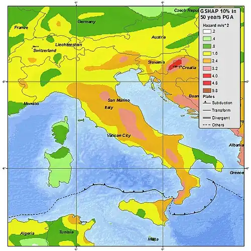 Due to the particular geodynamic situation (convergence of the Eurasian plate with the African plate) the Italian territory is frequently subject to earthquakes, giving it the record in Europe for these phenomena.[2] Out of 1,300 destructive earthquakes that occurred in the 2nd millennium in the central Mediterranean Sea, 500 affected Italy.[3]