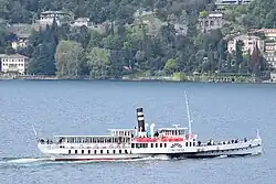 Paddle wheelers are still in operation on some lakes in Southern Bavaria, such as Diessen (49 m, 161 ft) on Ammersee, built in 1908 and converted to a diesel system in 1975.[15] It was completely rebuilt in 2006. As paddle wheelers have proven to be such a great tourist attraction, even a new one was built in 2002 on Ammersee, Herrsching, but it has never been powered by steam. On lake Chiemsee, RMS Ludwig Fessler (53 m, 174 ft) is still in regular service.[16] It was built in 1926, but since 1973 it has also been powered by diesel engines. The original diesel engine was the last ship engine built by Maffei (no. 576). This engine has ended up in Switzerland to drive the newly renovated Neuchâtel, launched in 2013.[17]
