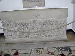 For the first few centuries in particular, little is known of the popes and their tombs, and available information is often contradictory. As with other religious relics, multiple sites claim to house the same tomb. Furthermore, many papal tombs that recycled sarcophagi and other materials from earlier tombs were later recycled for their valuable materials or combined with other monuments. For example, the tomb of Pope Leo I was combined with Leos II, III, and IV circa 855, and then removed in the seventeenth century and placed under his own altar, below Alessandro Algardi's relief, Fuga d'Attila. The style of papal tombs has evolved considerably throughout history, tracking trends in the development of church monuments.[2] Notable papal tombs have been commissioned from sculptors such as Michelangelo and Gian Lorenzo Bernini.