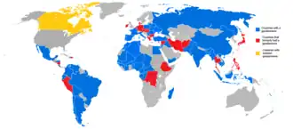 Although pioneered in France, the concept of a gendarmerie was adopted by several other European nations during the Napoleonic Wars.[1] It remains an integral part of the military establishment in most Francophone states and territories.[1] A somewhat related phenomenon has been the formation of paramilitary units which fall under the authority of civilian police agencies. Since these are not strictly military forces, however, they are not considered gendarmeries.[2] 20 gendarmeries and 1 observer are part of the International Association of Gendarmeries and Police Forces with Military Status (FIEP) as of 2024.[3] 7 EU states are part of the European Gendarmerie Force, with 1 partner and 1 observer.[4]