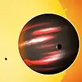 Represents multiple milestones in exoplanetary discovery, such as the first exoplanet known observed to transit its host star, the first exoplanet with a precisely measured radius, one of first two exoplanets (other being HD 189733 Ab) to be observed spectroscopically[41][42] and the first to have an atmosphere detected, containing evaporating hydrogen, and oxygen and carbon. First extrasolar gas giant to have its superstorm measured.[43] Also first (indirect) detection of a magnetic field on an exoplanet.[44] Nicknamed "Osiris". | |