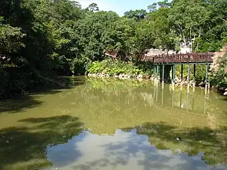 In Chinese language terminology, smaller bodies of water (ponds) are designated the terms 「池」 ("-chi"), 「塘」("-tang") or 「潭」("-tan"); larger bodies of water are designated as 「湖」("-hu", lake) and 「沼」("-zhao", marsh); while bodies of water with multiple functions such as irrigation, electricity generation, flood control, etc are called 「水庫」 ("-shuiku", lit. water storage).[2]