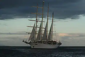 | Wind Song[9] | 1987 | H | SNACH | 440 ft (130 m) | 52.1 ft (15.9 m) | 4-mast motor-sailer | Steel | 21,500 sq ft (2,000 m2) | 5,350 GRT | Cruise ship, scuttled | ||